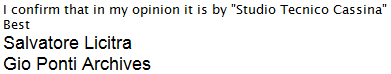 "I confirm that this model was not design by Gio Ponti, but by Cassina's studios. Please find enclosed a catalog page from 1964".